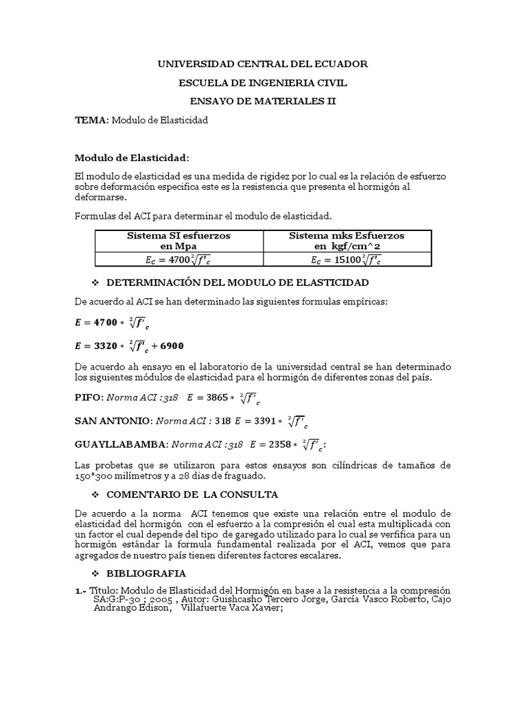 Es decir, que una vez deformado puede regresar a su forma original. Teniendo en cuenta los efectos de la fluencia y la retracción parcial es el código da la siguiente expresión para la relación a largo plazo modular. La elasticidad es una propiedad física de la que gozan ciertos cuerpos, que les permite cambiar su forma en el caso de que estén bajo un estiramiento, volviendo naturalmente a su posición de reposo cuando deja de estarlo. De tal forma que en este caso el enunciado nos indica que el esfuerzo es de 600 newtons y que la deformación es de 20 cm por lo tanto al sustituir estos datos en la expresión de la fuerza elástica obtenemos que Módulo de elasticidad del concreto, determinación usos modulus of elasticity of concrete, determination and uses ramírez matías ariadna montserrat, escuela de.